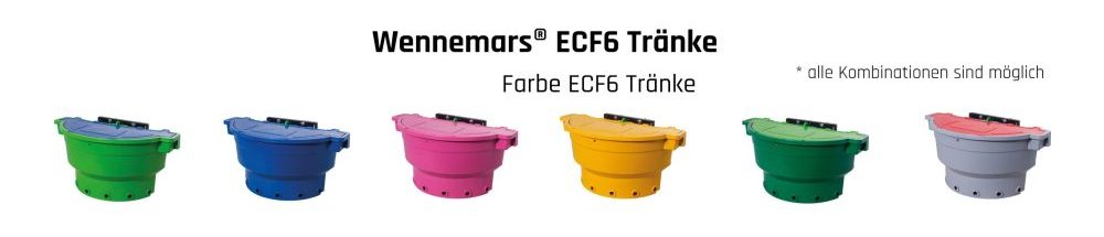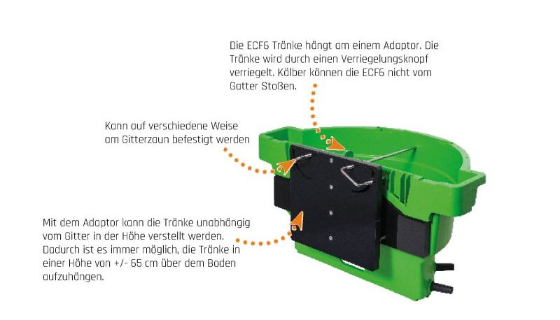 Die ECF6 Tränke besteht aus einer Tränke und einem Adaptor (die Halterung, an der die Tränke befestigt wird). Die Länge des Adaptors sorgt dafür, dass der Nuckel immer in einer Höhe von +/- 65 cm über dem Boden hängt.