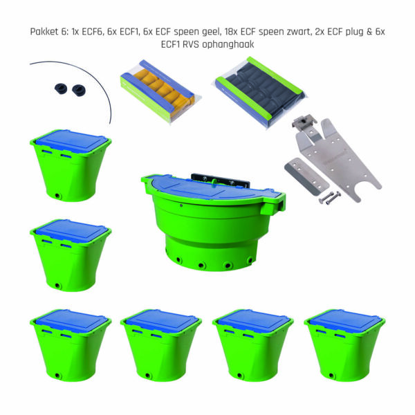 Dieses Startpaket ermöglicht Ihnen einen kompletten Start mit dem Wennemars® ECF-Kälbertränkesystem. Starten Sie bis zu 6 neugeborene Kälber mit dem ECF-System. Bringen Sie den Kälbern mit dem gelben ECF-Nuckel das selbstständige Trinken bei. Wechseln Sie dann zum schwarzen ECF-Nuckel. Wenn die Kälber in die Gruppe kommen, nehmen Sie den schwarzen ECF-Nuckel von der ECF1- zur ECF6-Tränke mit. Verschließen Sie alle verbleibenden Löcher mit einem ECF-Blindstopfen.