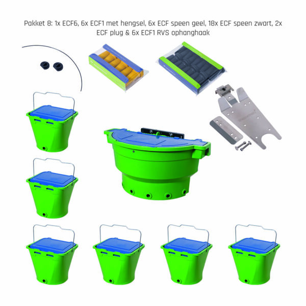 Dieses Startpaket ermöglicht Ihnen einen Premium-Start mit dem Wennemars® ECF-Kälbertränkesystem. Starten Sie bis zu 6 neugeborene Kälber mit dem ECF-System. Bringen Sie den Kälbern bei, selbstständig mit dem gelben ECF-Nuckel zu trinken. Wechseln Sie dann zum schwarzen ECF-Nuckel. Wenn die Kälber in die Gruppe kommen, nehmen Sie den schwarzen ECF-Nuckel von der ECF1- zur ECF6-Tränke mit. Verschließen Sie alle verbleibenden Löcher mit einem ECF-Blindstopfen.